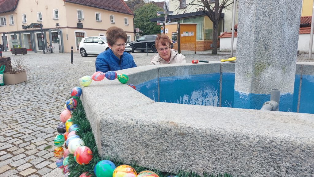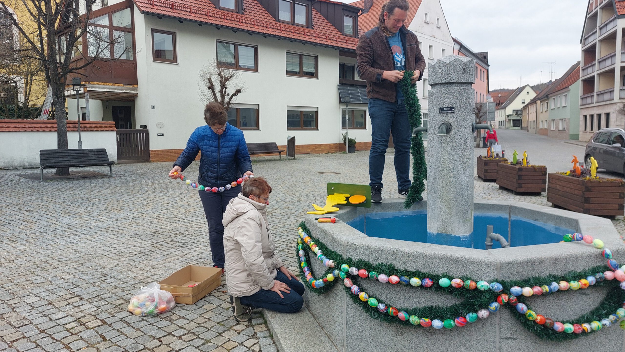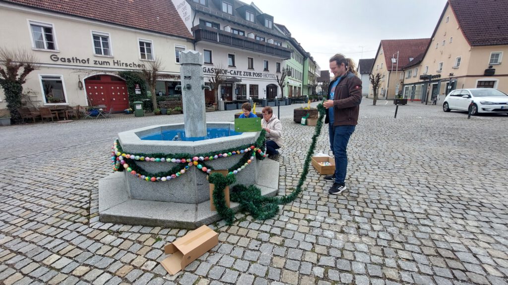 Die mit dem Projekt Marktbrunnen beauftragten Person vom Gartenbauverein fassten den Brunnenrand mit Girlanden aus Grün und bunten Ostereiern ein. Wie sich im Gespräch herausstellte, wird das Projekt Osterbrunnen im Jahre 2027 noch umfangreicher ausfallen. Denn da ist es geplant, dem Brunnen noch eine Krone zu gönnen. Material dafür sei wohl vorhanden, aber müsste erst noch restauriert werden. Da alles Engagement ehrenamtich in dieser Angelegenheit erfolgt, braucht es noch eine Weile.