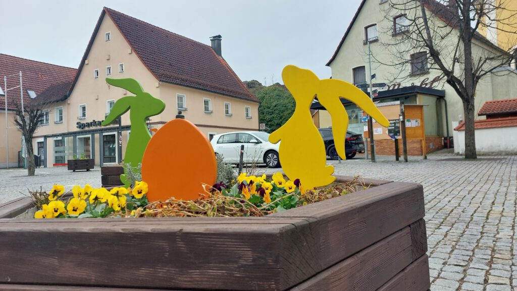 Der Königsteiner Marktplatz wird von großen Blumenkübeln zu Straße hin begrenzt. Alle diese Kübel wurden zur Zierde in der Osterzeit mit schönen Reliefs von Hasrn und Ostereiern bestückt.